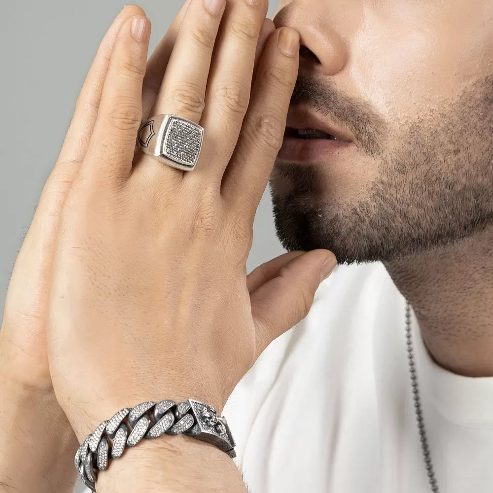 16mm Unique Fleur-De-Lis Iced Cuban Link Bracelet for Men | Dark Oxidized 925 Silver Bracelet | With Certificate of Authenticity and 925 Hallmark