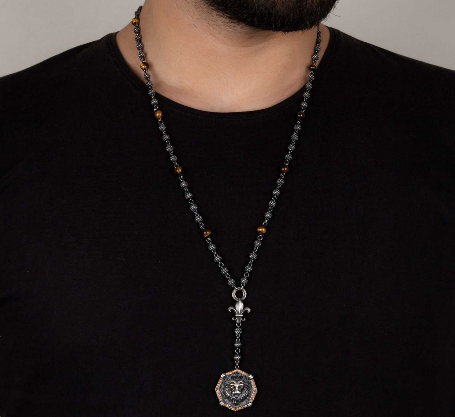 Gental Gems by Karat Kings | Unique Silver Balls & Natural Tiger Eye Beaded Chain Necklace with Lion Head | Sterling Silver Oxidized Pendant with Fleur-de-lis Symbol | Men's Jewelry | With Certificate of Authenticity and Hallmark