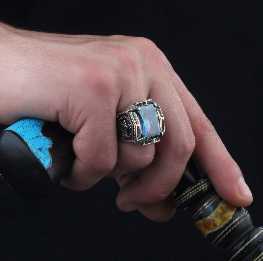 Gental Gems by Karat Kings | Unique Designed Turkish Style Heavy Ring with Multicolored Alexandrite | 925 Sterling Silver Oxidized Ring | Men's Jewelry | With Certificate of Authenticity and 925 Hallmark