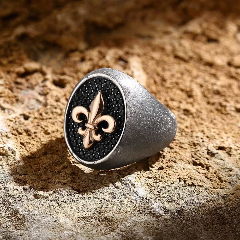 Gental Gems by Karat Kings | Exclusive Fleur de Lis Ring Studded with Black Cubic Zirconia, Sterling Silver Ring | Jewellery for Men| With Certificate of Authenticity and Hallmark