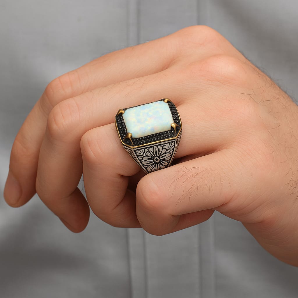 - PRODUCT DETAILS: This Exclusive Pure Sterling Silver Ring is an Unique Turkish Style Men Ring. Designed for ALPHA MEN. 100% Natural Opal is 10Ct plus and is australian by origin. And the side stone is black onyx which we can remove also if not desired by customer upon request.