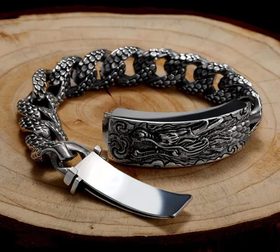 16mm wide Unique Embossed Dragon Bracelet for Men | Sterling Silver Bracelet | With Certificate of Authenticity and Hallmark